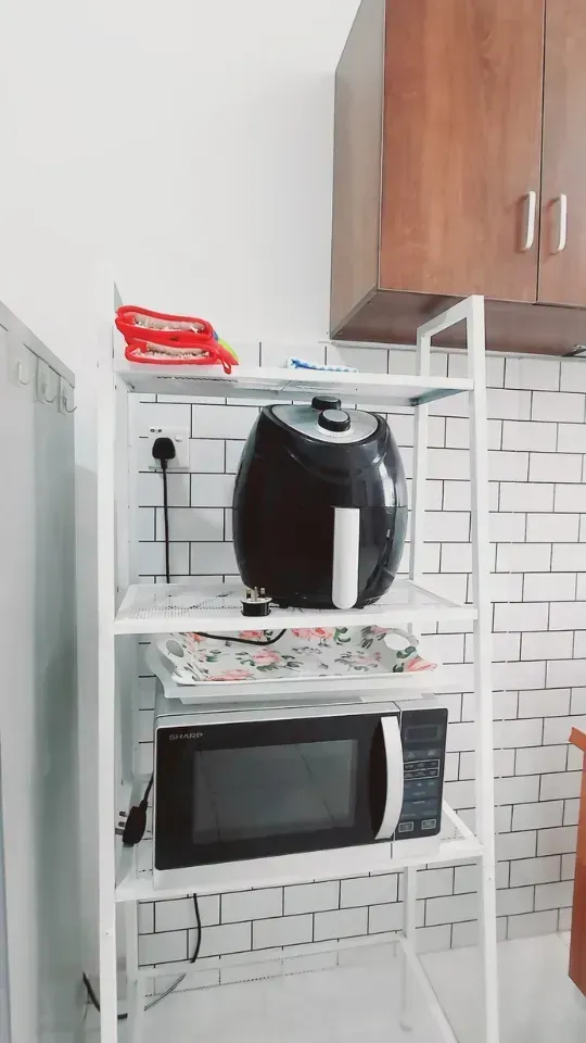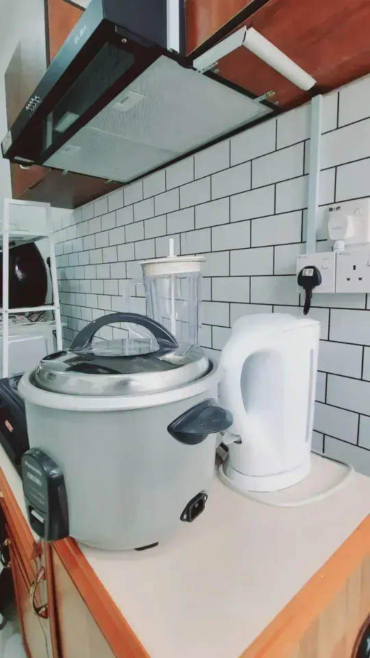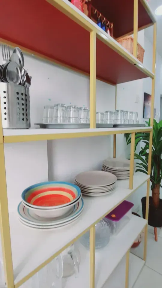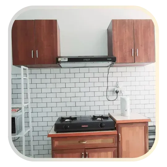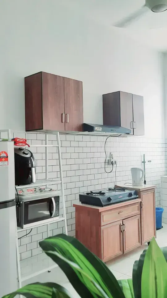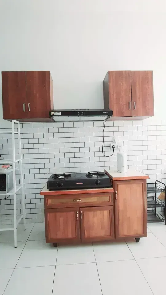 Ruang dapur ada dapur gas, perkakasan elektrik, dan pinggan mangkuk.