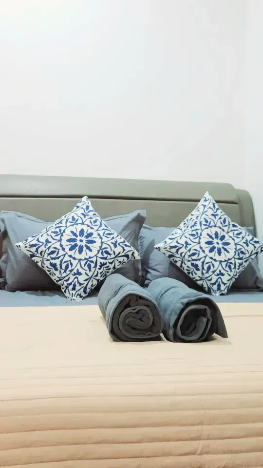 Master Bedroom ada set katil king, bilik air dalam, air-cond, almari baju/cermin, dan tuala mandi.