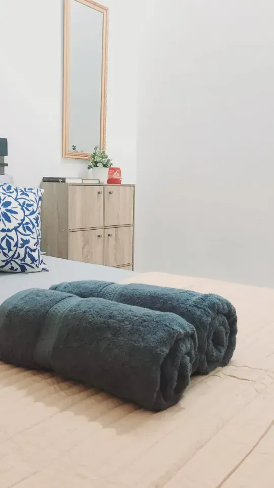 Bilik kedua ada set katil queen, air-cond, cermin, dan tuala mandi.